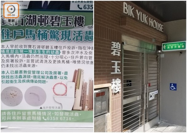 寶石湖邨至少5單位沖廁水驚現活蟲 專家估計是搖蚊幼蟲 在 9月 26, 2020 取得連結 Facebook X Pinterest 電子郵件 其他應用程式 碧玉樓有單位的沖廁水湧出活蟲,區議員貼出告示通知。(蘇偉明攝)上水公屋寶石湖邨沖廁水驚現蟲患,有住戶的廁所水內出現大量長約1厘米的活蟲,而且出盡方法, ...來源 source: http://hk.on.cc